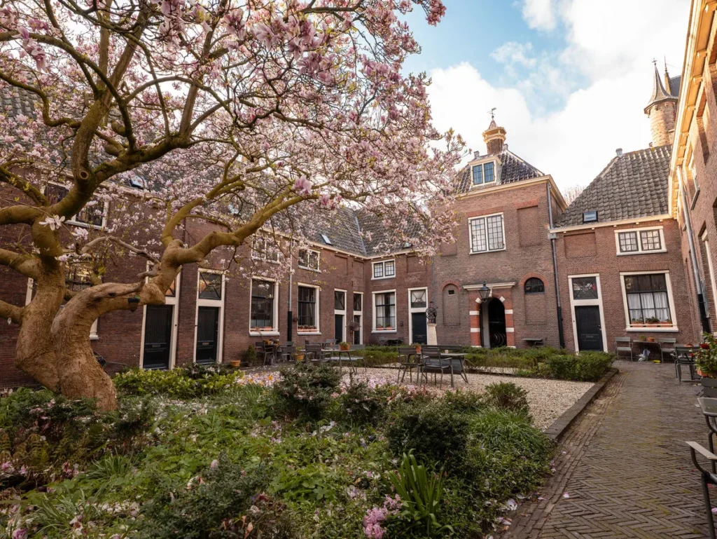 Binnen vind je een idyllische binnenplaats met klimrozen en een zonovergoten bankje. Een van de best bewaarde geheimen van Leiden, een perfect voor een rustmoment tijdens een stadswandeling door het historische Pieterskwartier.